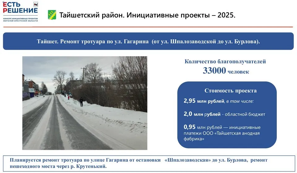- Обустройство тротуара и пешеходного мостика через р. Крутенький по улице Гагарина Тайшета от остановки общественного транспорта «Шпалозаводская» до перекрестка улиц Гагарина и Бурлова — 2 950 000 рублей