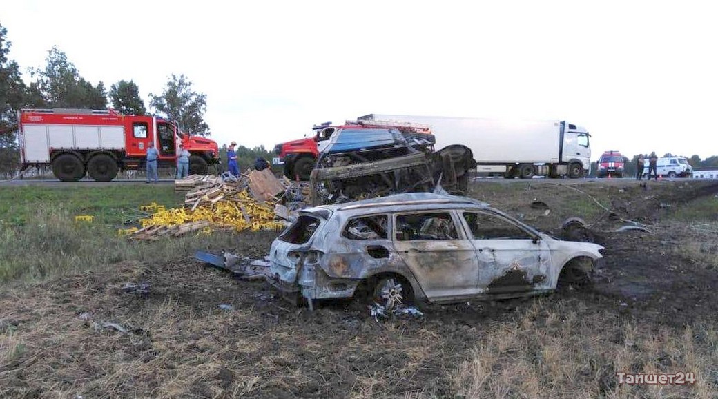 В результате Volkswagen, LADA и фура воспламенились. Mitsubishi раздавило прицепом грузовика.