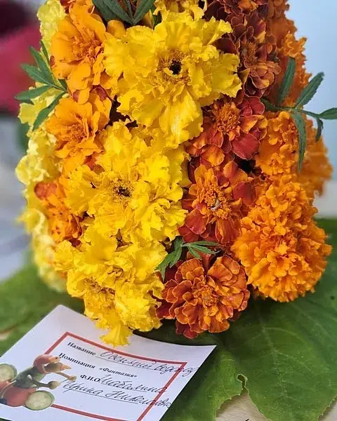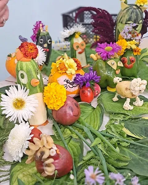 Гостей ждали ярко и оригинально оформленные букеты и цветочные композиции, забавные поделки из овощей и фруктов.