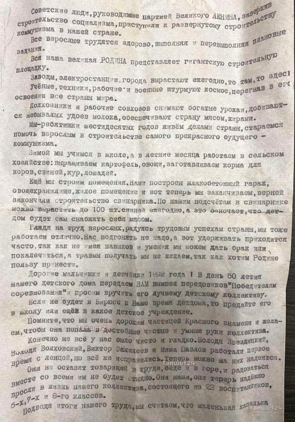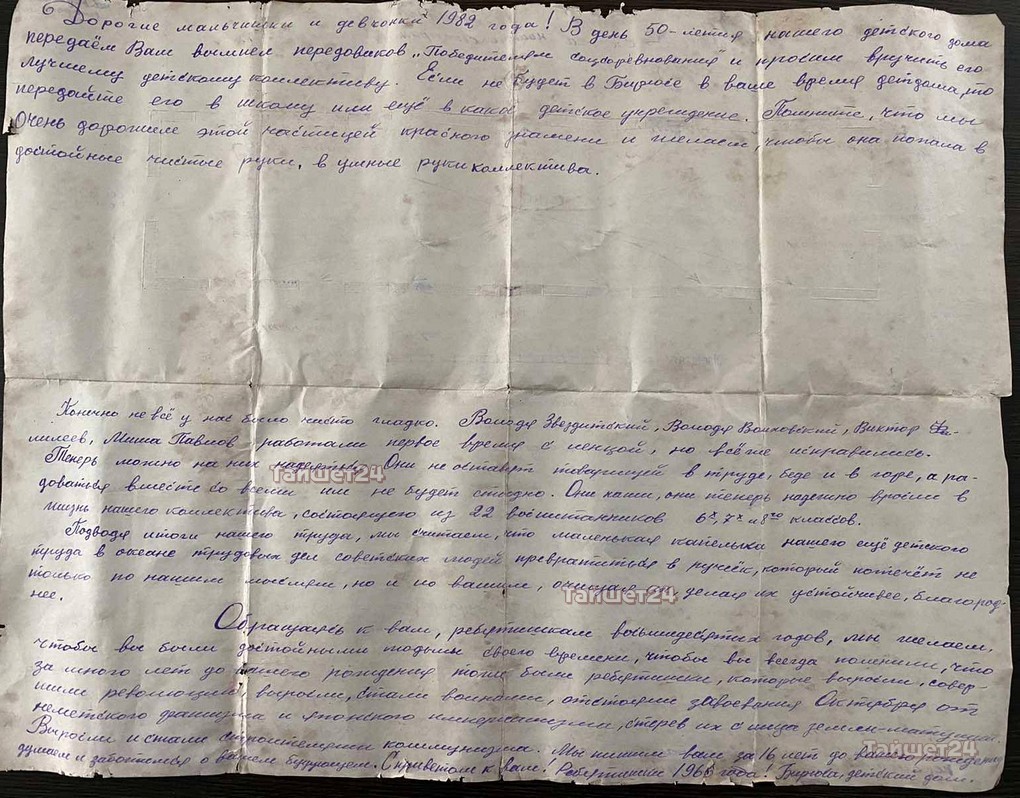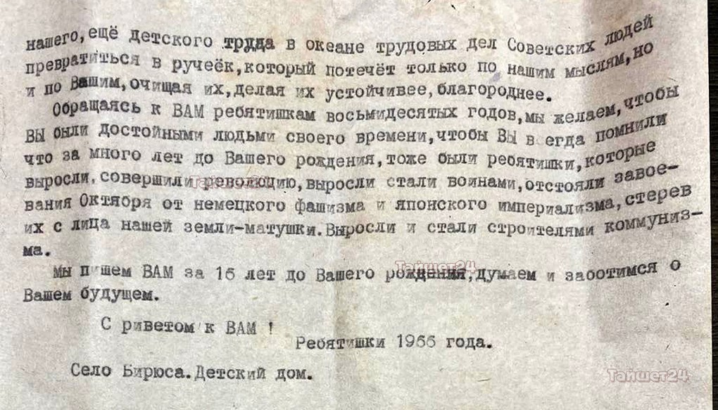 Ученики 6-8 классов обратились к детям 1982 года (именно в этот год Бирюсинский детский дом праздновал своё 50-летие) и попросили передать вымпел передовиков «Победителям соревнований» лучшему детскому коллективу. Также ребята рассказали о светлом коммунистическом настоящем и своих достижениях.