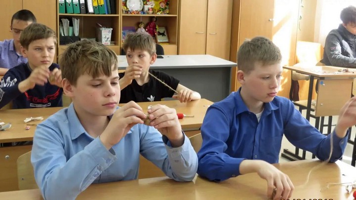 Под руководством Ольги Лазуткиной и Елены Реутовой мальчики и девочки складывали джут и перевязывали его красной нитью — этот цвет на Руси всегда считался цветом жизни, все обереги мотались красными нитками.