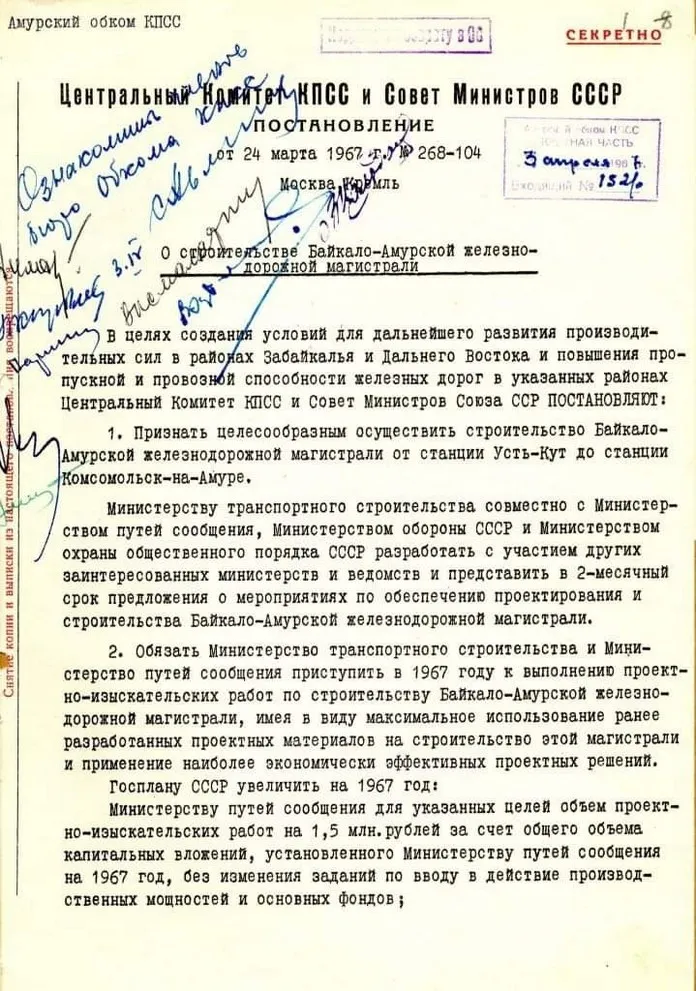 24 марта 1965 года принято постановление ЦК КПСС и Совета Министров СССР «О строительстве Байкало-Амурской железнодорожной магистрали».