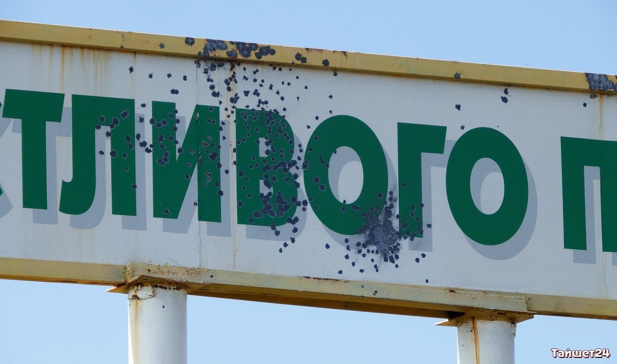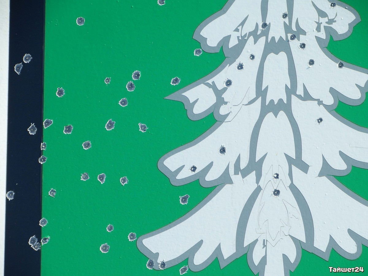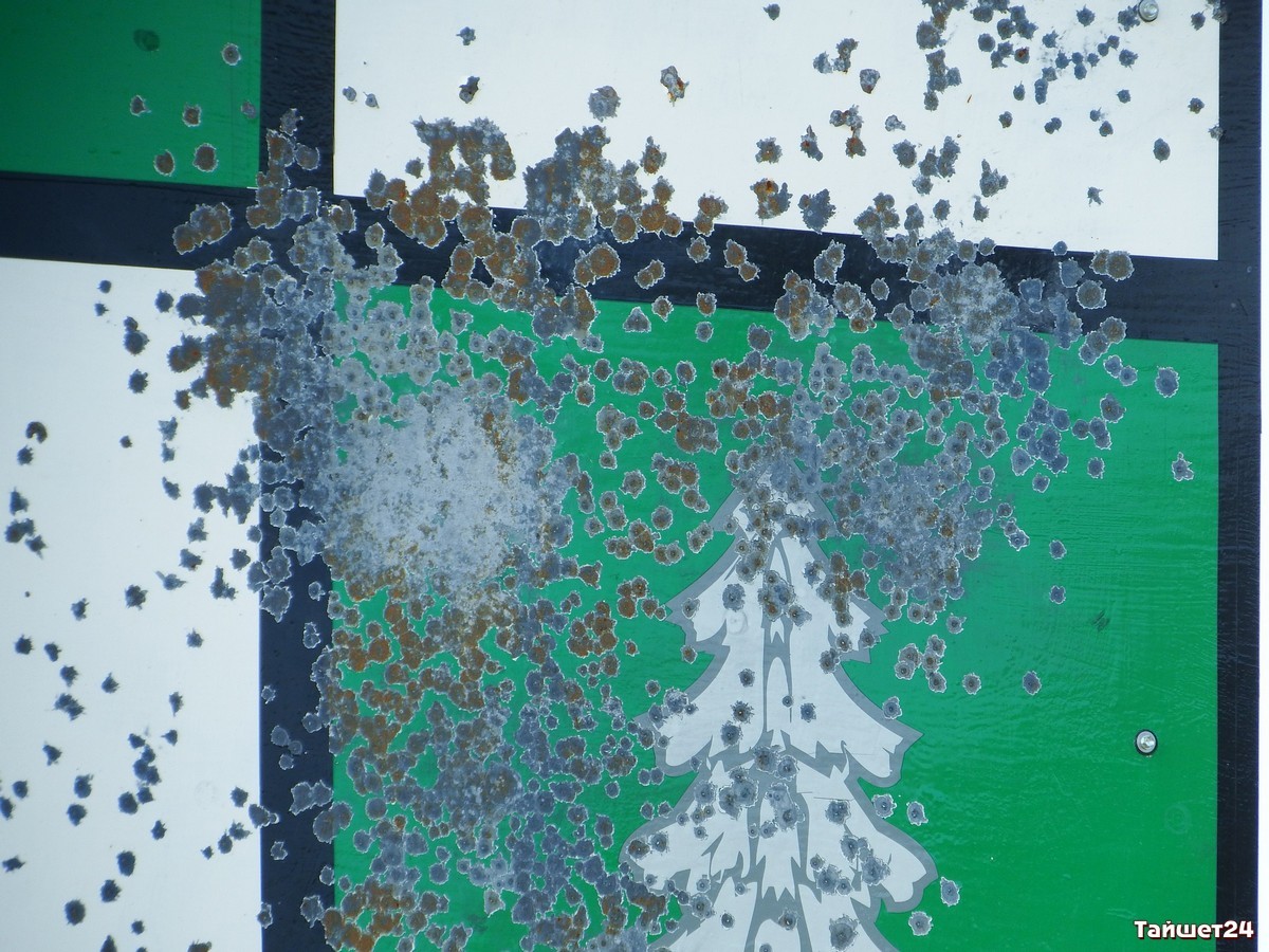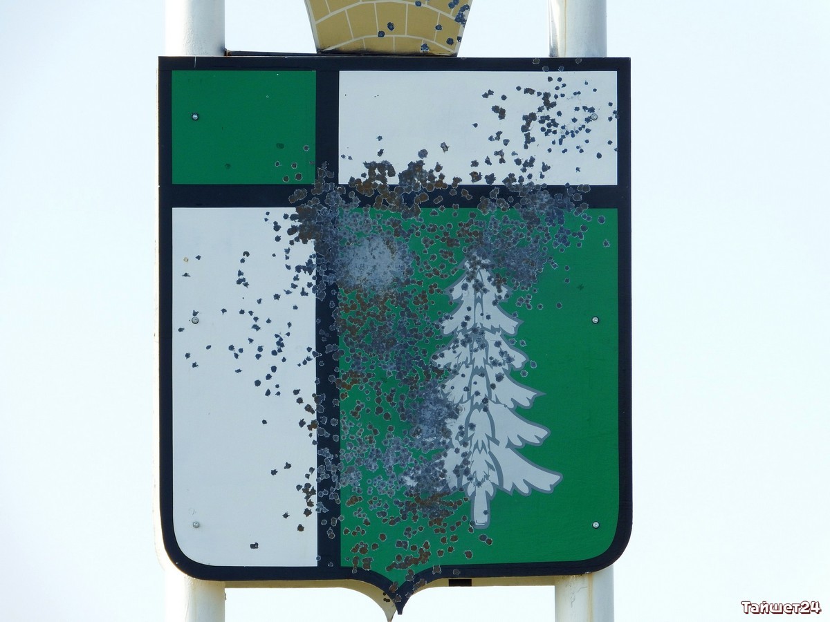 Очередная варварская выходка в Тайшете. На въезде в город со стороны бывшего аэропорта неизвестные изрешетили из пневматического оружия стелу с гербом города.