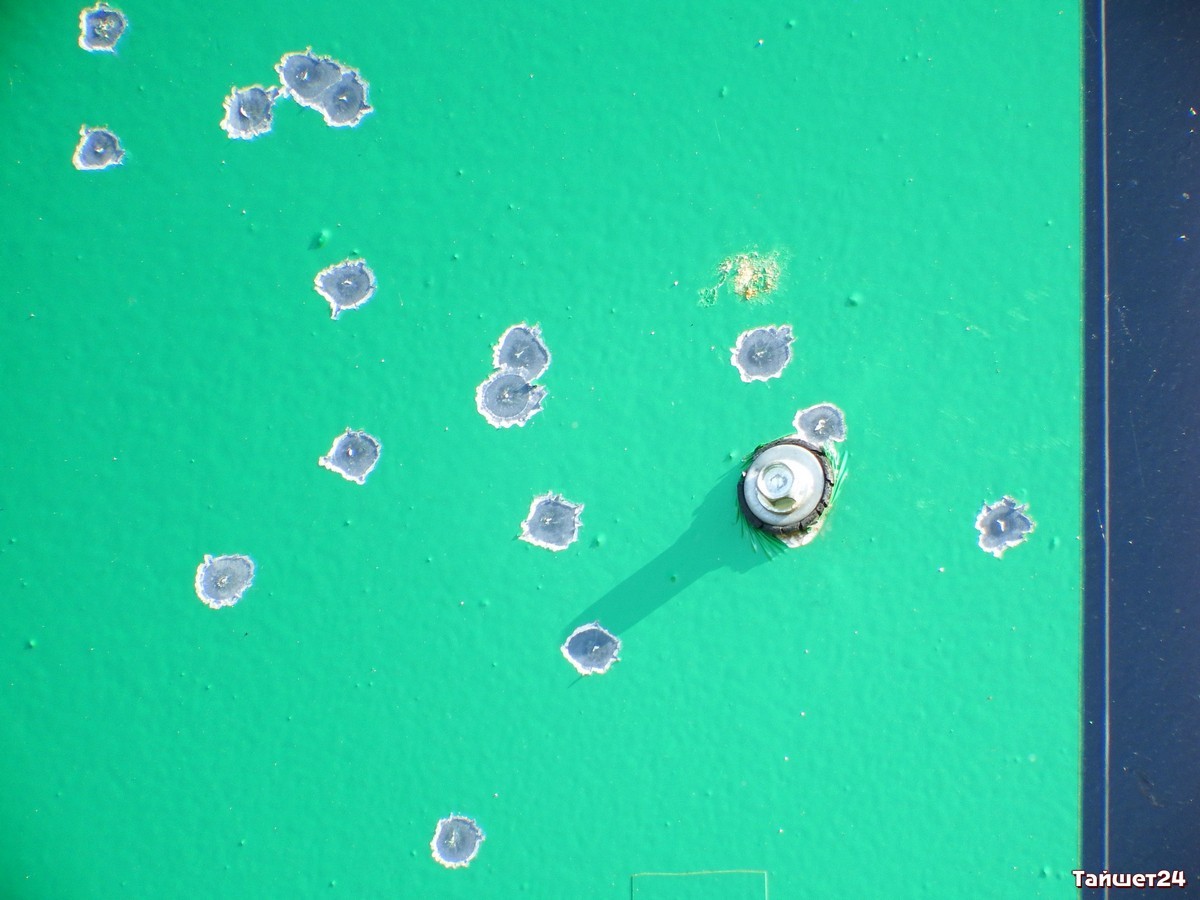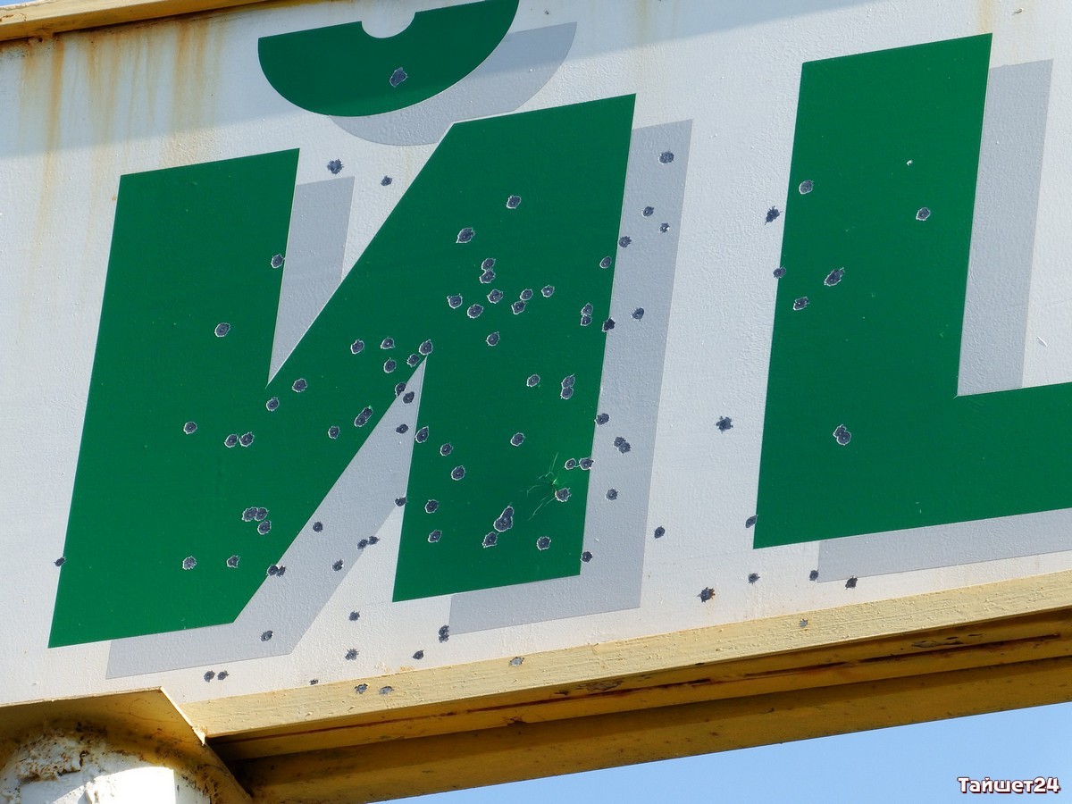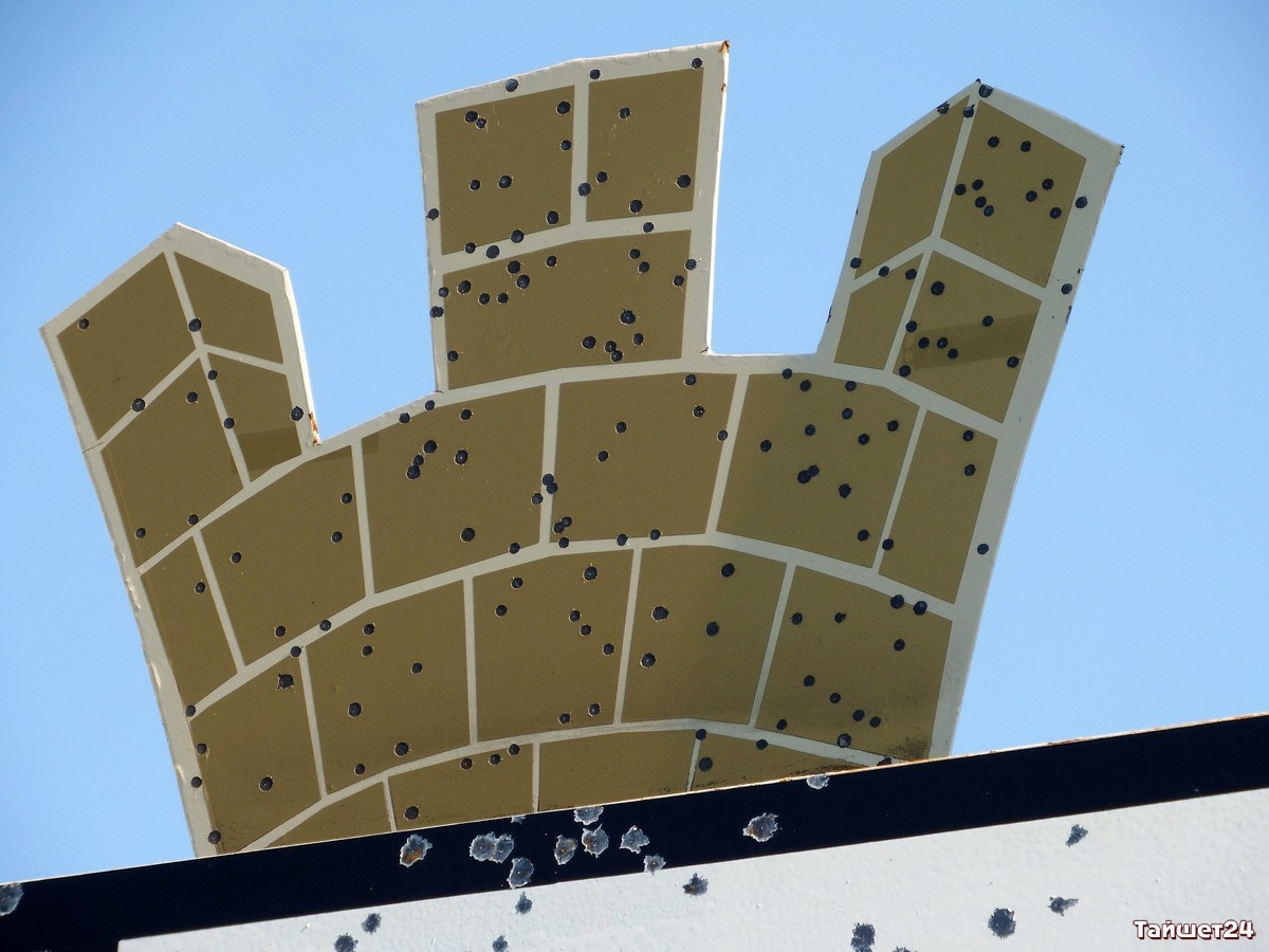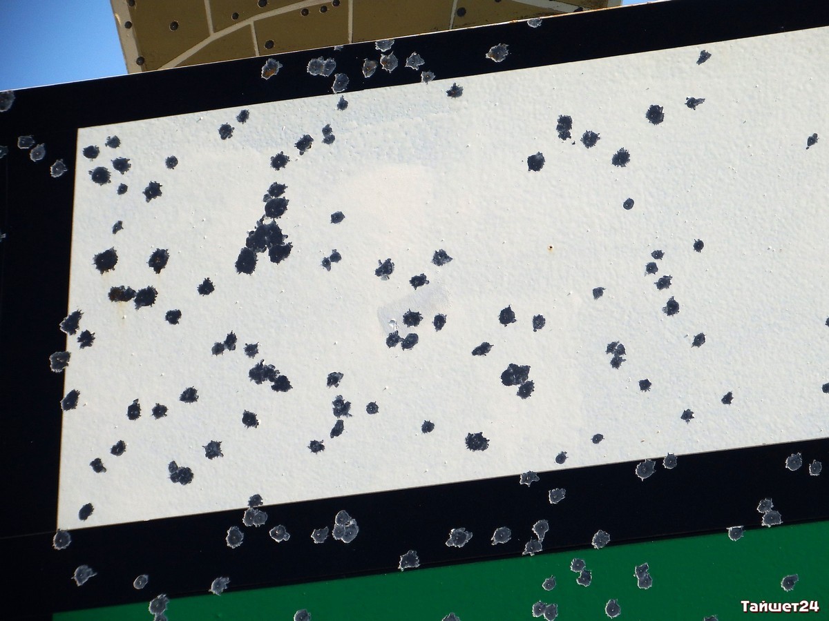 Очередная варварская выходка в Тайшете. На въезде в город со стороны бывшего аэропорта неизвестные изрешетили из пневматического оружия стелу с гербом города.