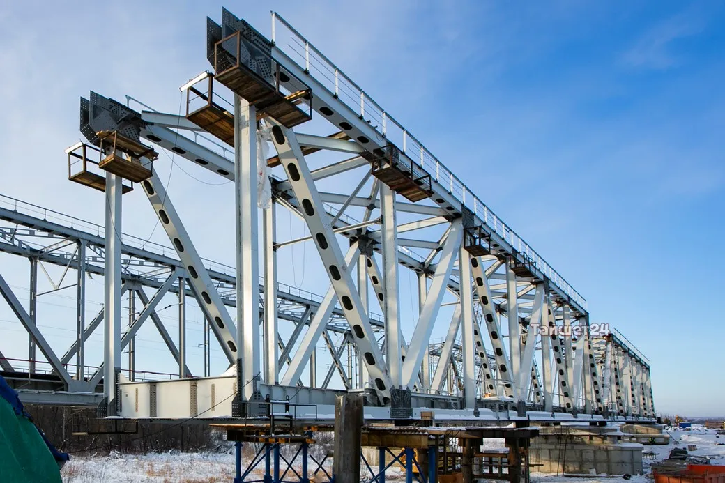 Рядом со строителями «ТранСтрой-Пути» на реке Бирюса трудятся строители «Мостоотряда №15». У них сложная задача – возвести мост для вторых путей. Сегодня уже собрано на левом берегу два готовых пролёта, на очереди – третий.