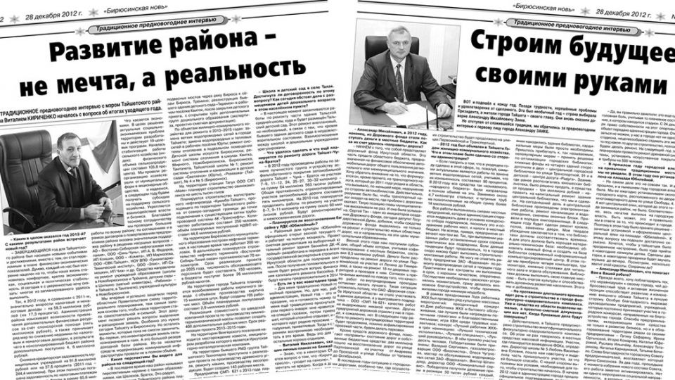 Последний номер «Бирюсинской нови» 2012 года традиционно был испещрён поздравительно-итоговыми текстами, какими-то воспоминаниями и мечтами. Как…