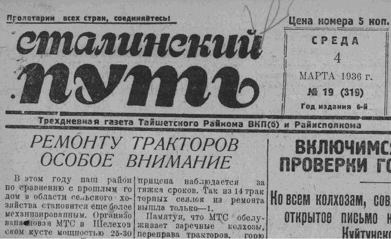 4 марта 1936 года Тайшетская газета «Сталинский путь писала: