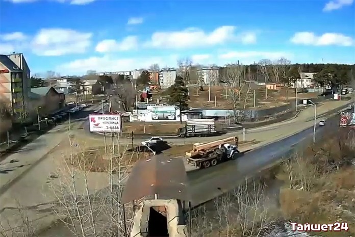 В Канске лесовоз с неисправными тормозами проехал по городу километр и перевернулся на кольце (видео)