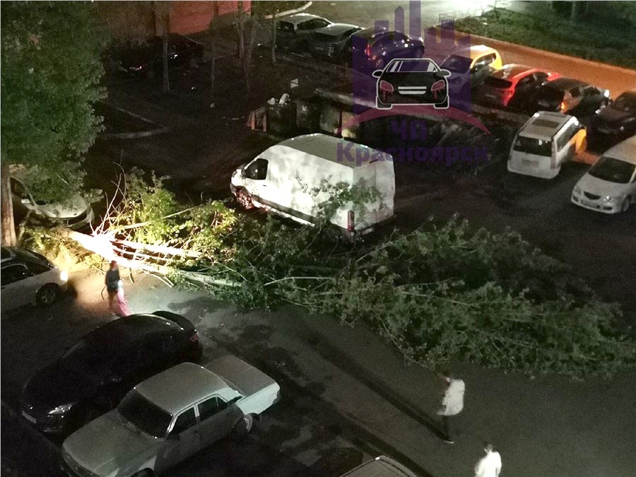 Бушующий в Красноярске ураган ломает деревья и срывает вывески