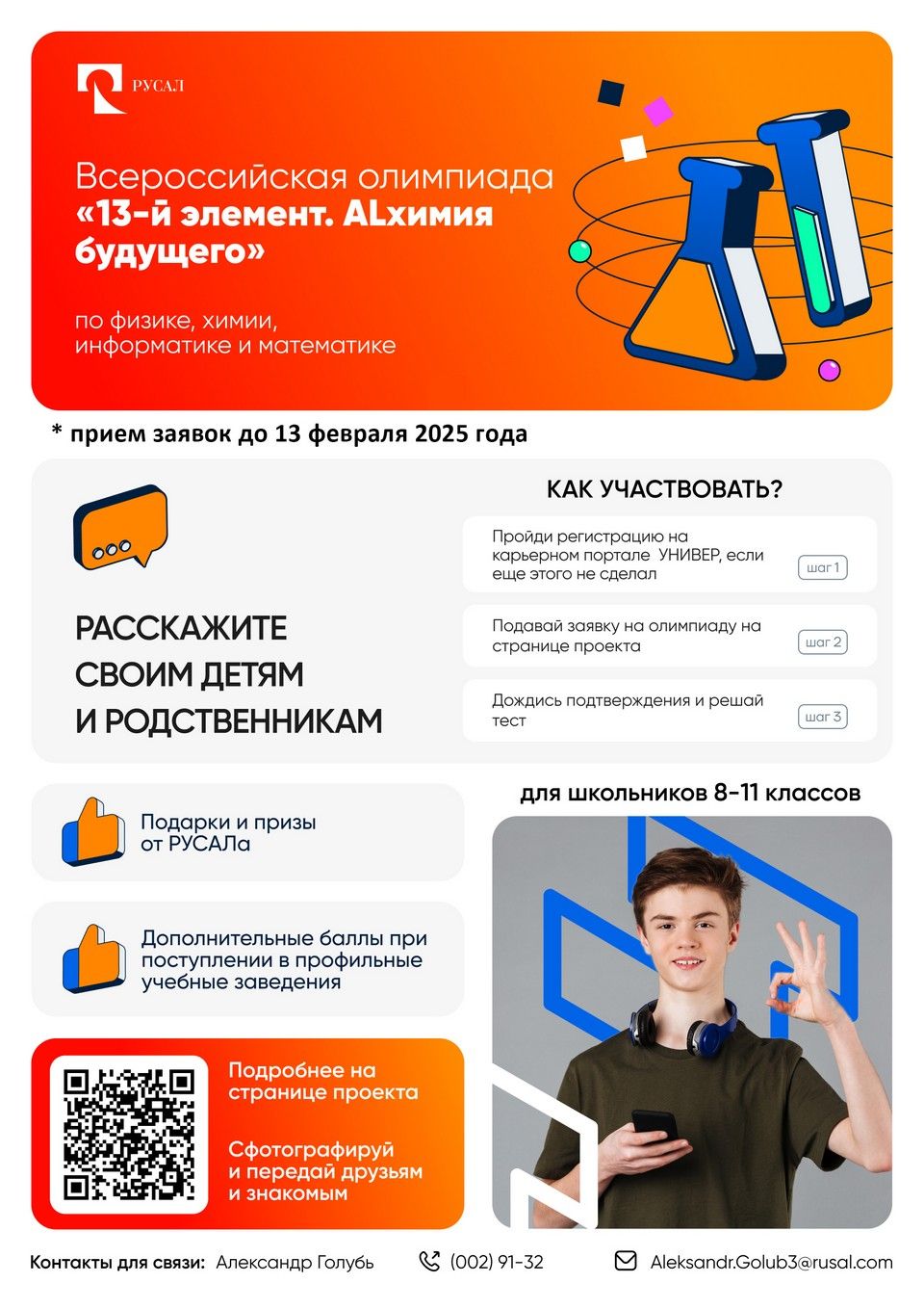 Компания РУСАЛ приглашает школьников принять участие в отборочном этапе олимпиады «13-й элемент. ALхимия будущего». Срок подачи…