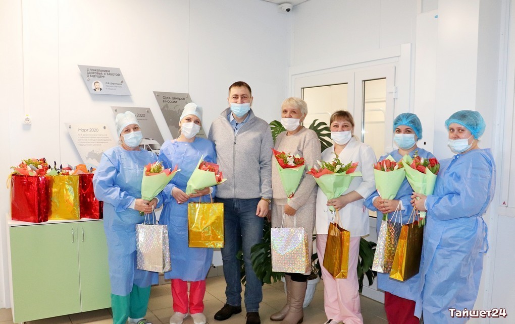 Букеты тюльпанов, подарки и благодарность от имени инициатора строительства Медцентра Олега Дерипаска накануне Международного женского дня…