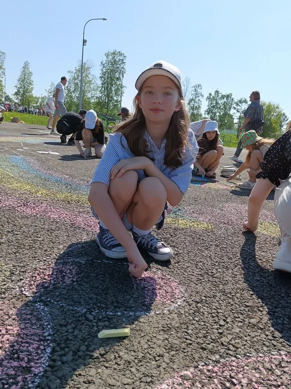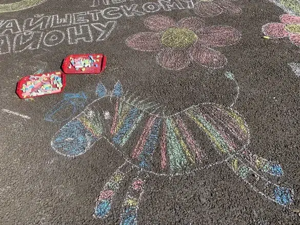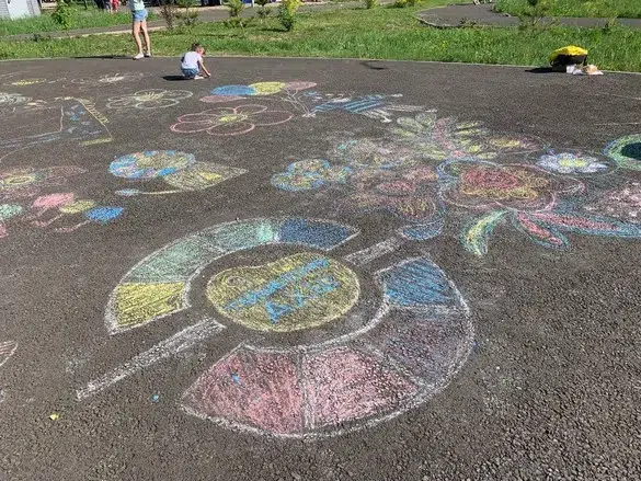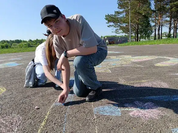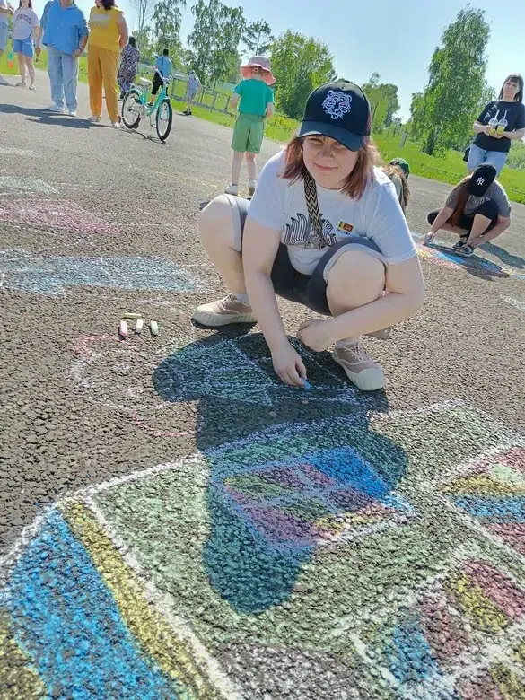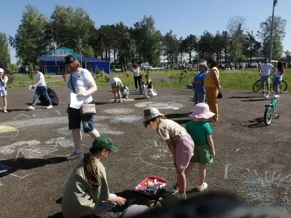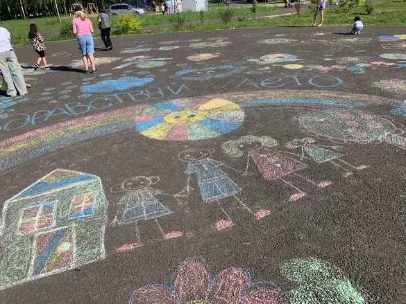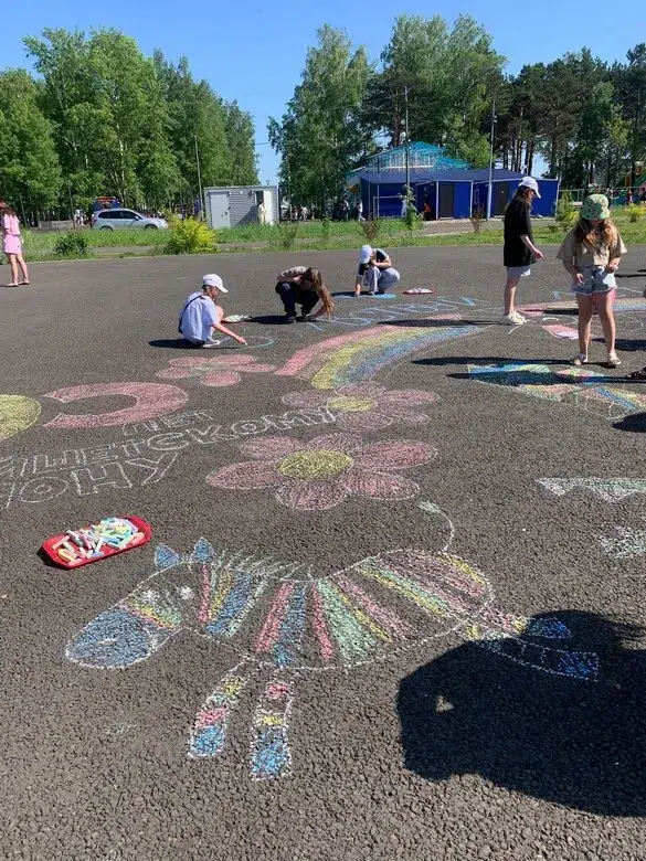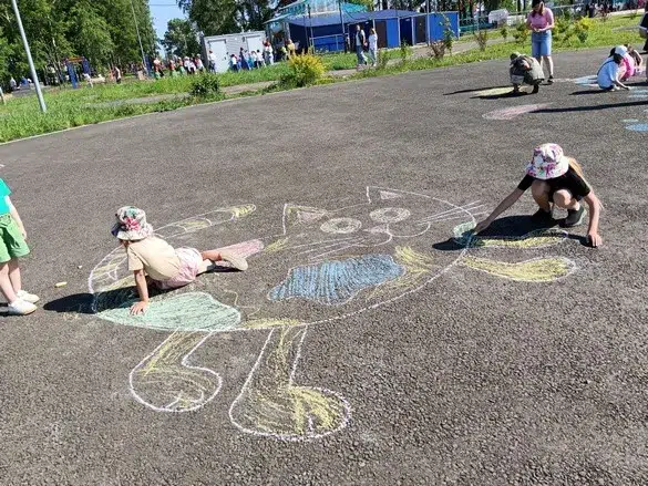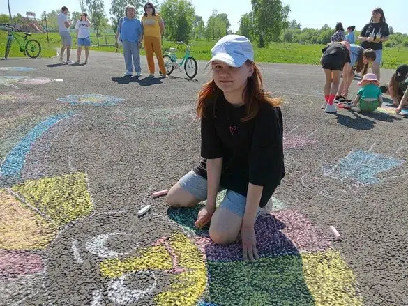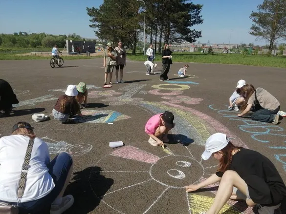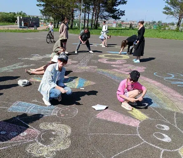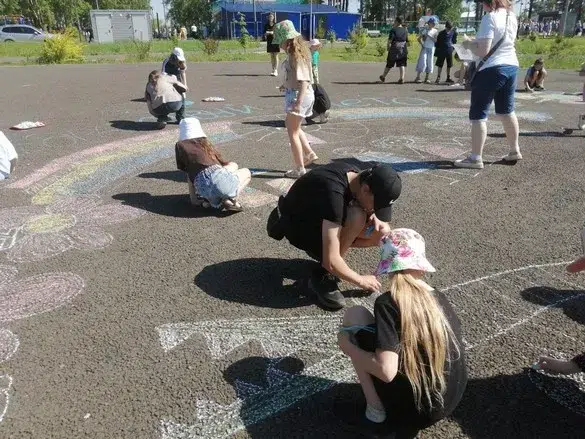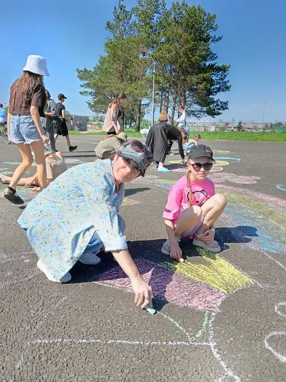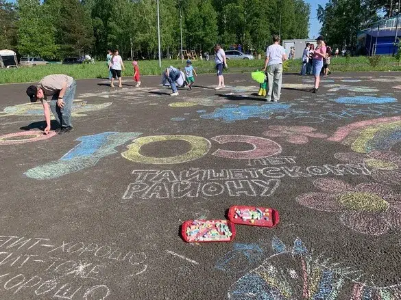 Сегодня в Городском парке на празднике детства ученики и преподаватели Тайшетской детской художественной школы, а также гости праздника — дети и родители — разноцветными мелками нарисовали яркие и добрые рисунки на асфальте.