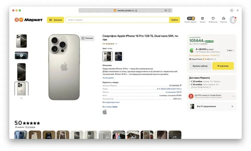 iPhone 16 Pro — самый мощный и актуальный смартфон Apple, выпущенный в сентябре 2024 года. Когда модель появилась на отечественном рынке, ее продавали за 170 тыс. рублей. Уже спустя месяц цена флагмана снизилась до 130 тысяч, а сейчас в последние дни распродажи 11.11 онлайн-магазины продают iPhone 16 Pro за 105-115 тыс. рублей. Экономия — более 50 тыс. рублей или почти 43%.