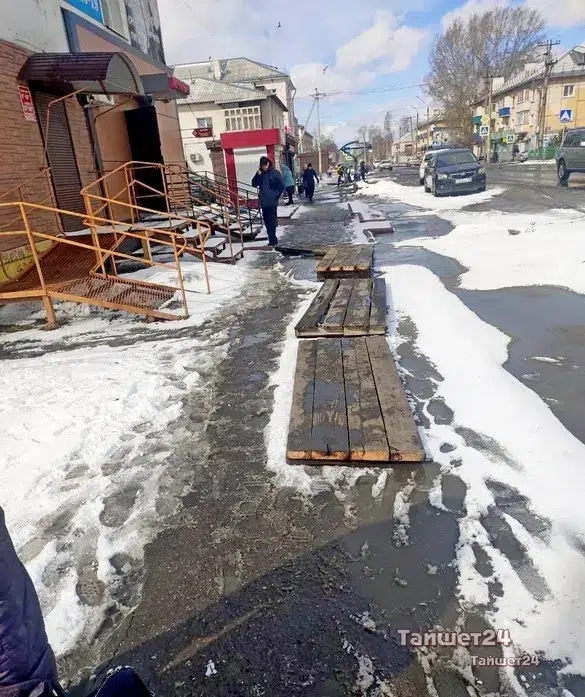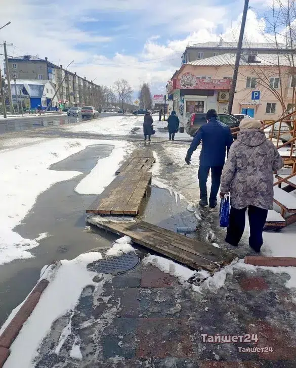 Таких тротуаров в Тайшете — множество. Кое-где заботливая рука кинула доски, которые призваны спасти ситуацию, но особых успехов на этом поприще у них нет.