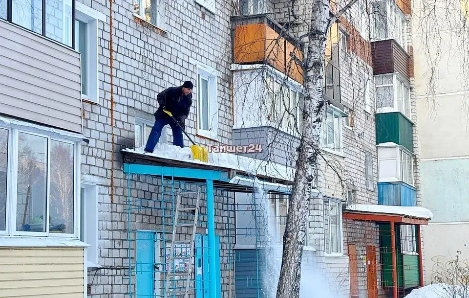Параллельно рабочие убирают накопившийся снег с козырьков подъездов.