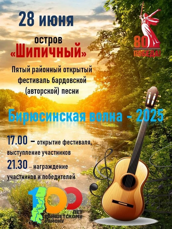 28 июня на берегу реки Бирюса (зона отдыха на острове Шипичный) состоится Пятый районный открытый фестиваль авторской (бардовской) песни «Бирюсинская волна — 2025».