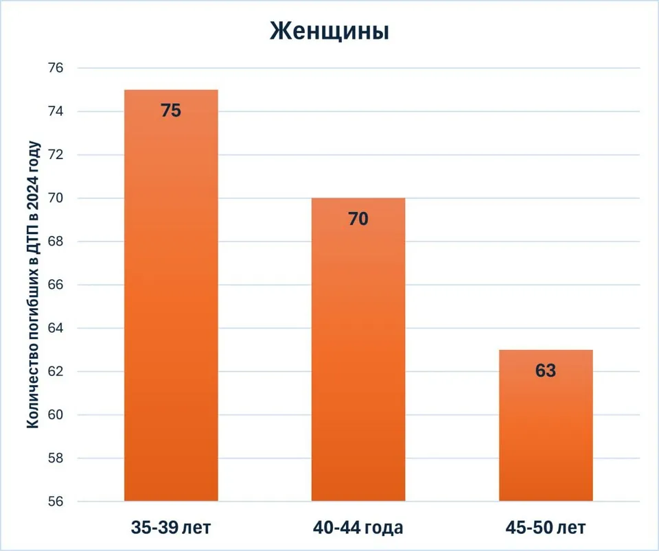 Среди женщин-водителей наибольшее число погибших в 2024 году пришлось на возрастную группу 35-39 лет – 75 человек.