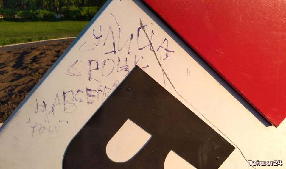 Стелу «Я люблю Тайшет» на площади «Юбилейной» установили в октябре 2018 года. С тех пор она ни разу не подвергалась покушениям со стороны местных вандалов. Но вечером 22 мая внезапно обнаружилось, что шаловливые ручки, в которых просто идеально смотрелась бы метла, добрались таки до патриотической фигуры.