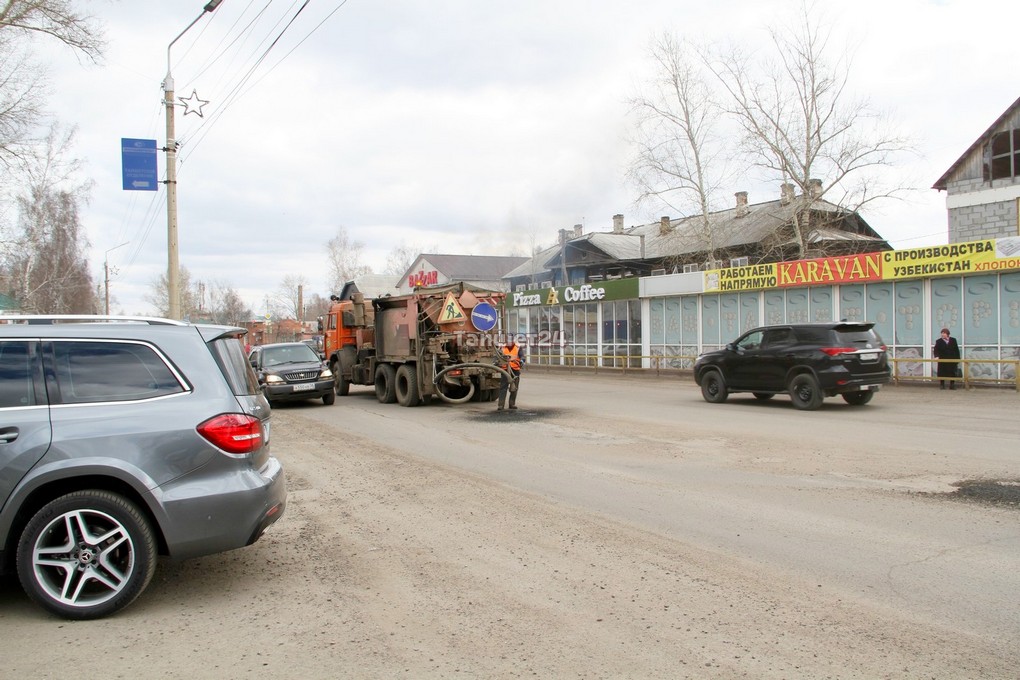 Дорожная служба Иркутской области 1 мая приступила к ямочному ремонту в Тайшете. Второй день техника работает на улице Суворова.