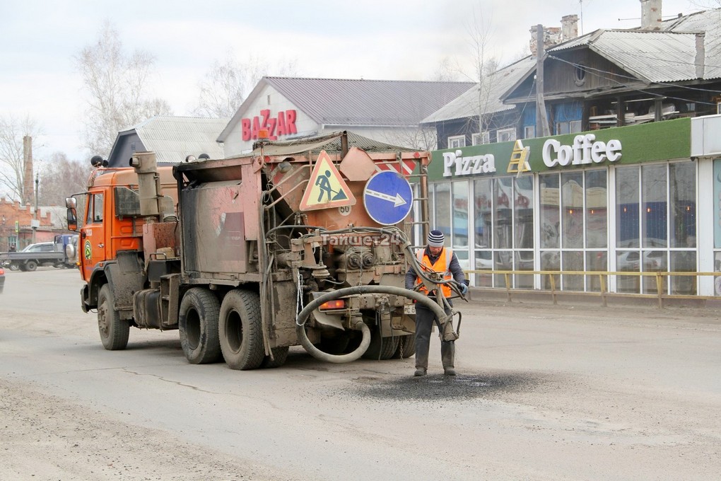 Дорожная служба Иркутской области 1 мая приступила к ямочному ремонту в Тайшете. Второй день техника работает на улице Суворова.
