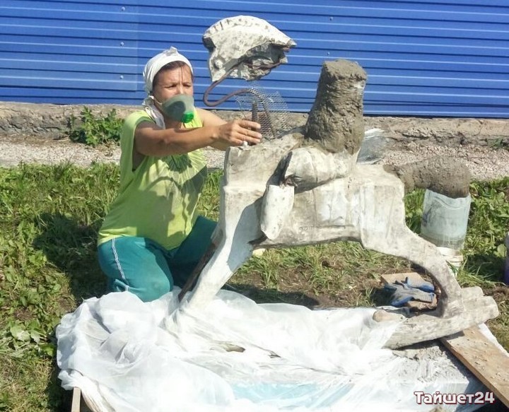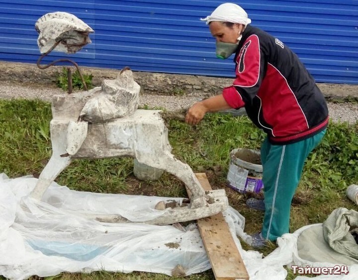В районном краеведческом музее начались работы по восстановлению скульптур, найденных весной при уборке улицы Александра Матросова, на месте бывшего Дома пионеров в Тайшете. Этим фигурам — мальчику на деревянной лошадке и девочке, качающей его, по 60 лет. Символизировали они счастливое детство.