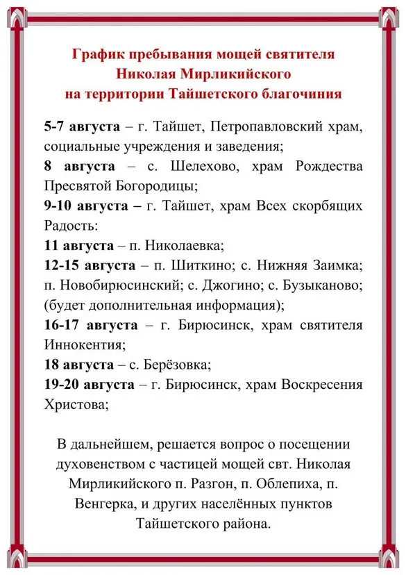 В рамках миссионерского Крестного хода святыня побывает в храмах и селениях Тайшетского района.
