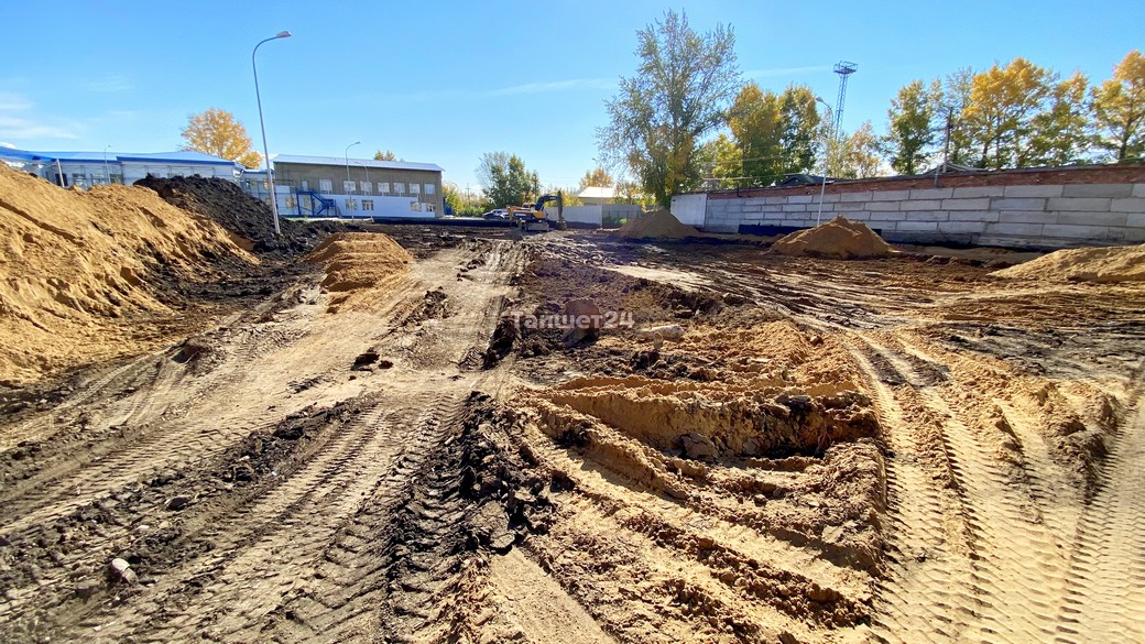 На территории школы №14 продолжается строительство стадиона. Создать здесь спортивный объект поручил губернатор области Игорь Кобзев.