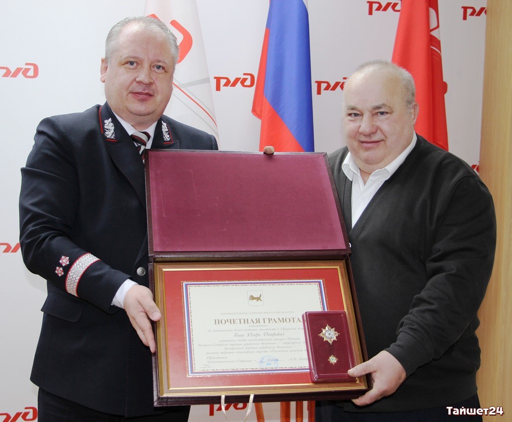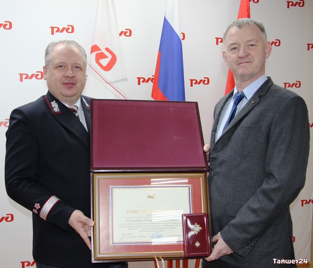 Почётных грамот Законодательного Собрания Иркутской области удостоились двое сотрудников Восточно-Сибирской железной дороги. Это – начальник района электроснабжения Тайшетской дистанции электроснабжения Дмитрий Жмулевский и составитель поездов железнодорожной станции Тайшет Игорь Гага. В торжественной обстановке награды им вручил депутат регионального парламента Виктор Шпаков.