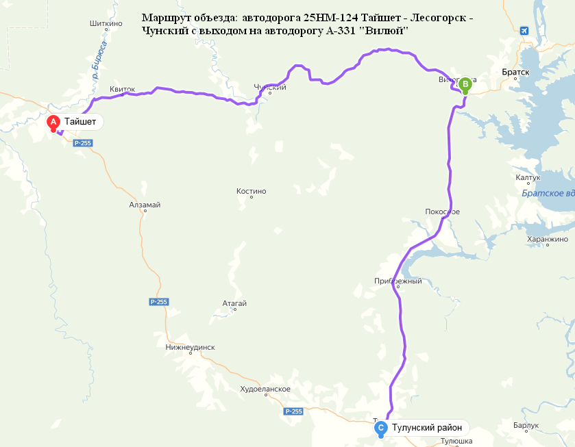 Информация будет обновляться в разделе сайта ФКУ Упрдор «Прибайкалье» «Оперативная информация». Маршрут объезда: н.п. Тайшет – Лесогорск – Чунский с выходом на автомобильную дорогу А-331 «Вилюй».