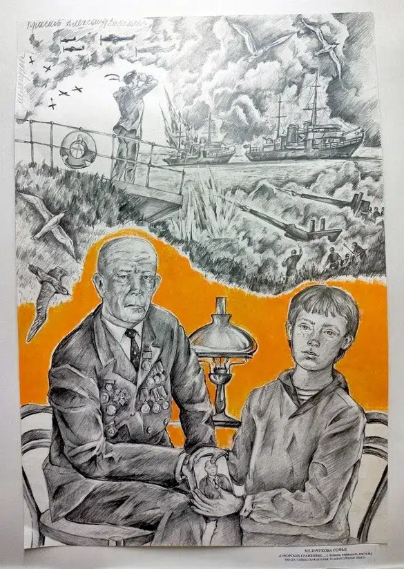 Юные художники с глубоким уважением подошли к созданию своих работ, передав в них героизм, мужество и стойкость советских воинов и тружеников тыла. В экспозиции представлены портреты героев, батальные сцены, трогательные моменты прощания с родными и долгожданного возвращения домой.