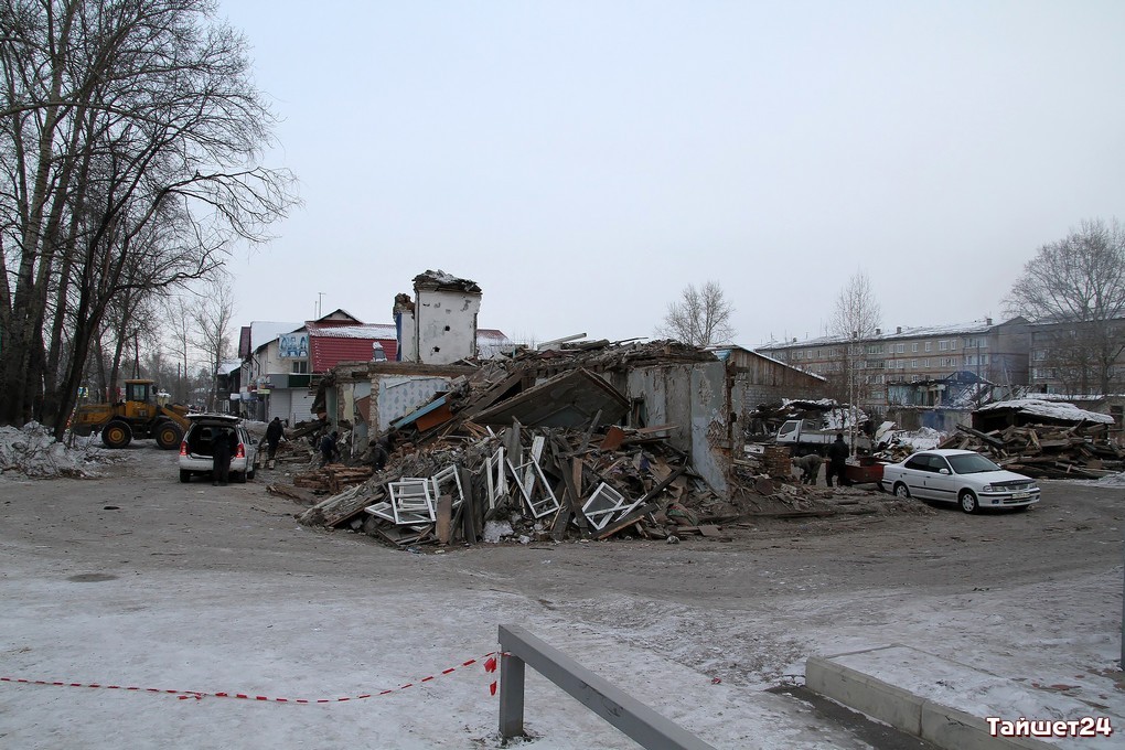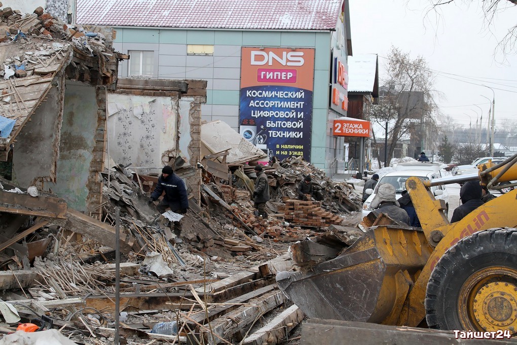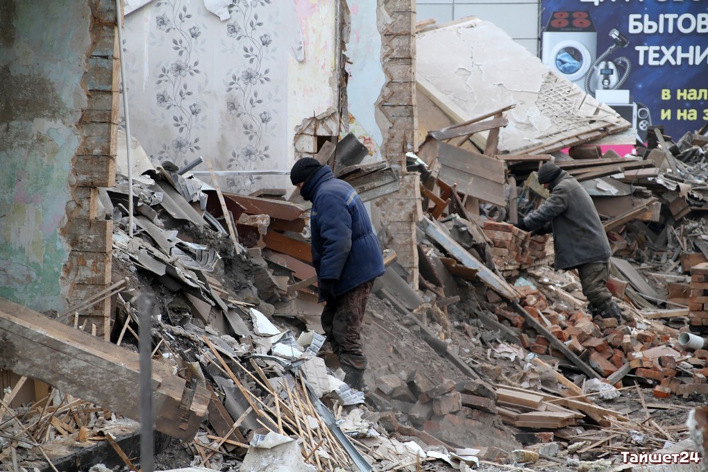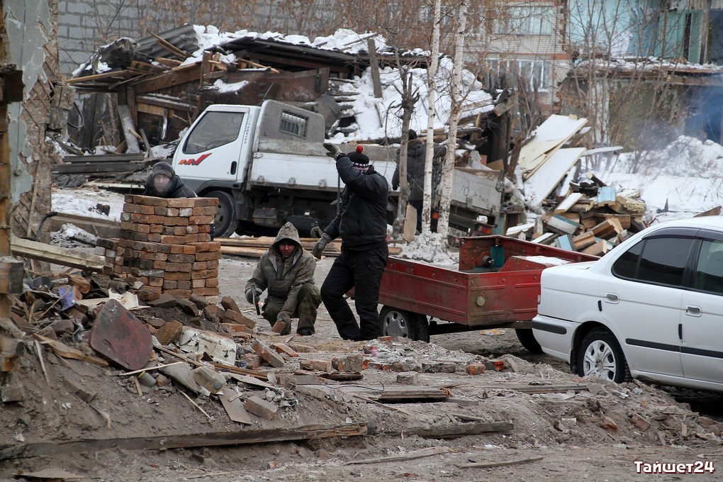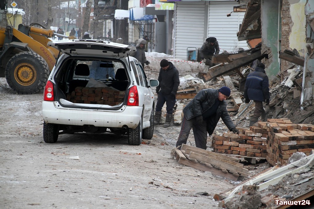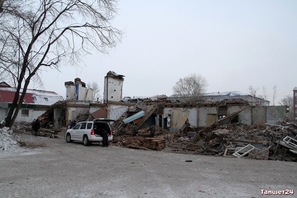 Недавно расселённый двухэтажный дом в самом центре Тайшета активно пошёл в расход. Неунывающие тайшетцы на развалинах, образовавшихся после демонтажа внешних стен, добывают кирпич — крепкий, надёжный и такой же вечный, как многое оставшееся в наследство с суровых советских времён.