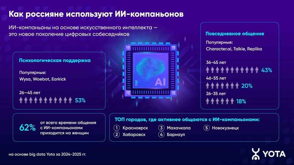 Интерес к ИИ-компаньонам в России стремительно растет. В 2025 году число пользователей таких сервисов удвоилось, а средний объём трафика вырос в четыре раза. Особенно активно жители страны общаются с виртуальными ботами, которые помогают справиться со стрессом и тревожностью. Их аудитория выросла почти в пять раз. Такие же тренды прослеживаются и в Иркутской области.