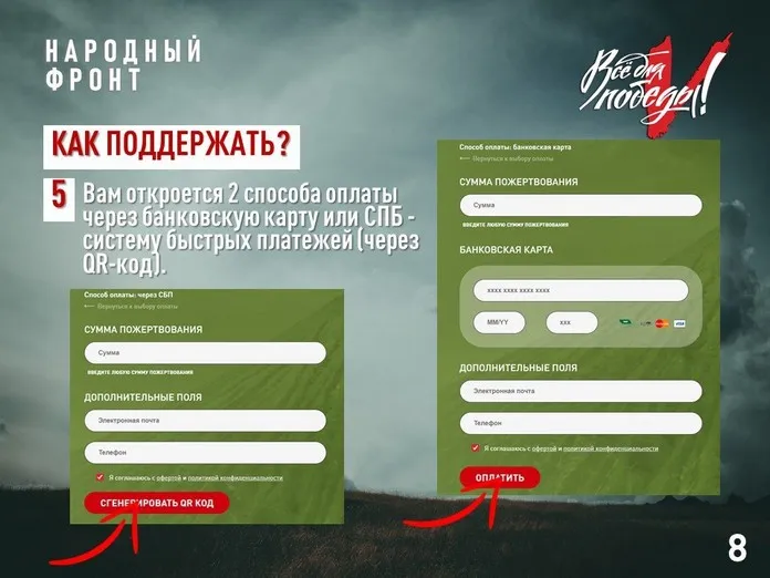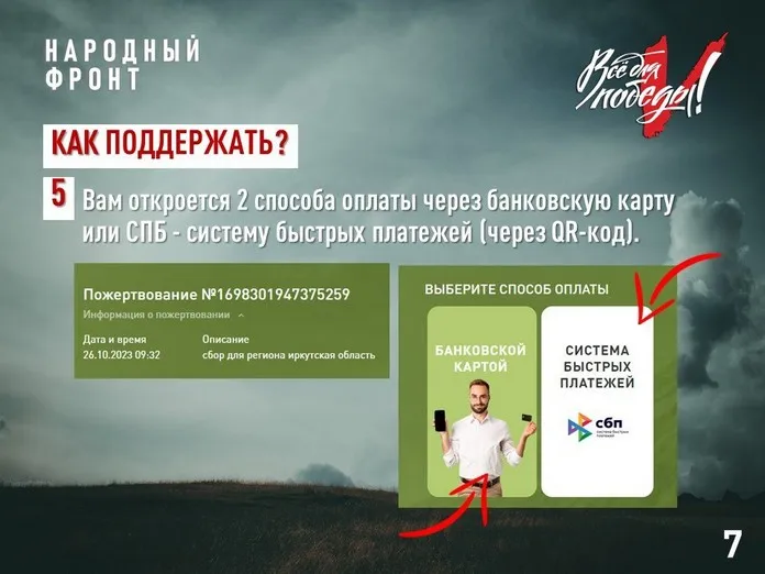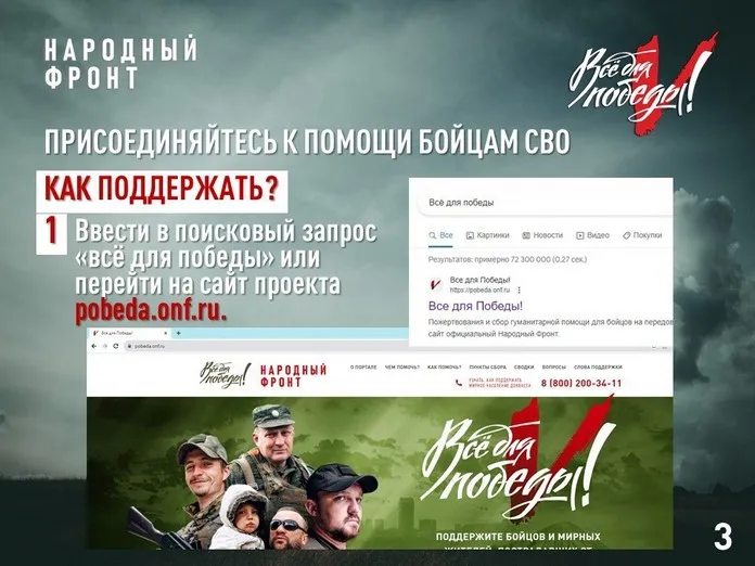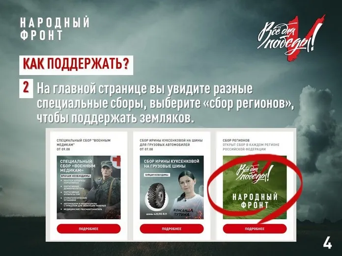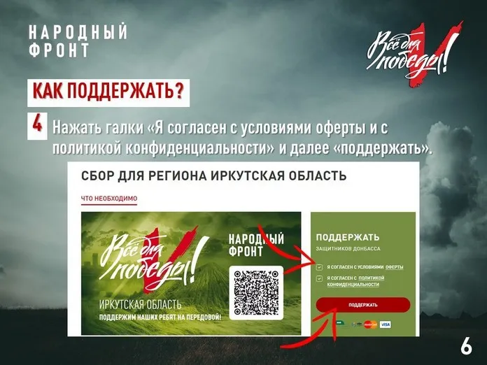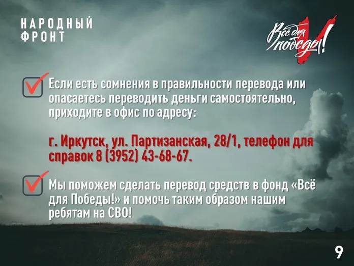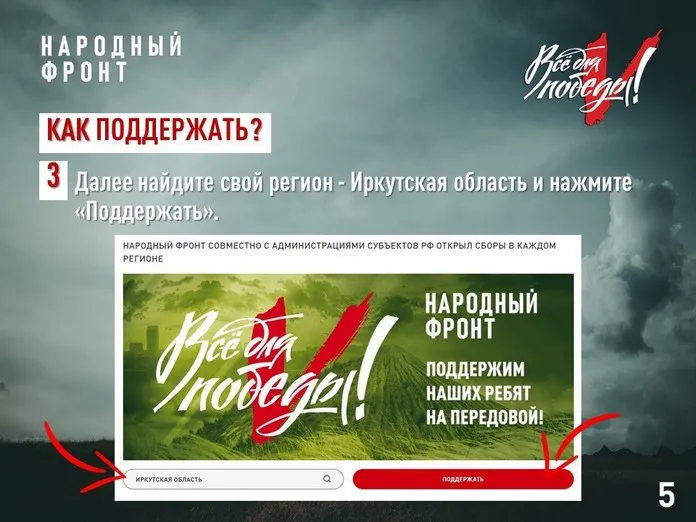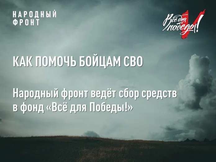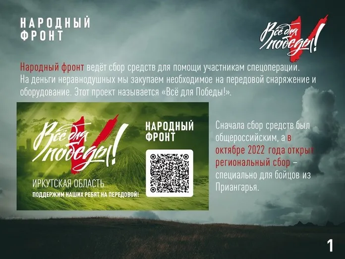 Народный фронт ведёт сбор средств для помощи участникам спецоперации практически с начала СВО в рамках проекта «Всё для Победы!». Сначала сбор средств был общероссийским, а в октябре 2022 года открыт региональный сбор — специально для бойцов из Приангарья.