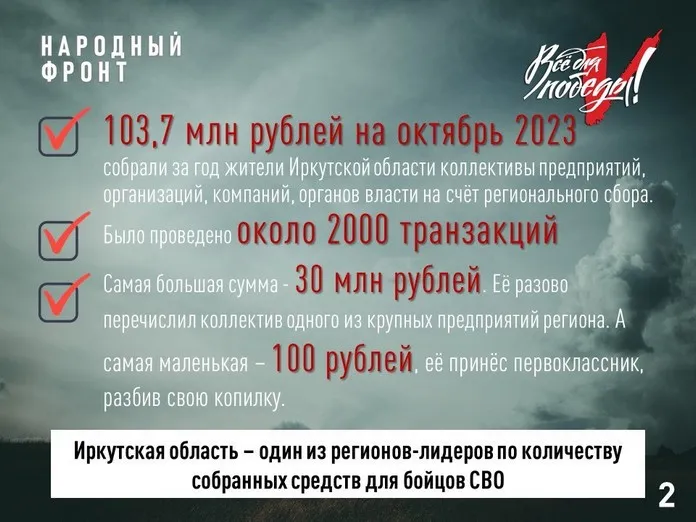 В октябре 2023 года исполнился год региональному сбору проекта Народного фронта «Всё для Победы!». За год жители Иркутской области, коллективы предприятий, организаций, компаний, органов власти собрали 103,7 млн руб.