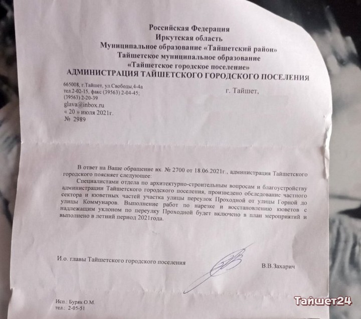 Люди решили заранее позаботиться о себе и своём имуществе и ещё в 2021 году подали заявку в администрацию Тайшета на нарезку кюветов в переулке Проходном, на участке от улицы Горной до Коммунаров.