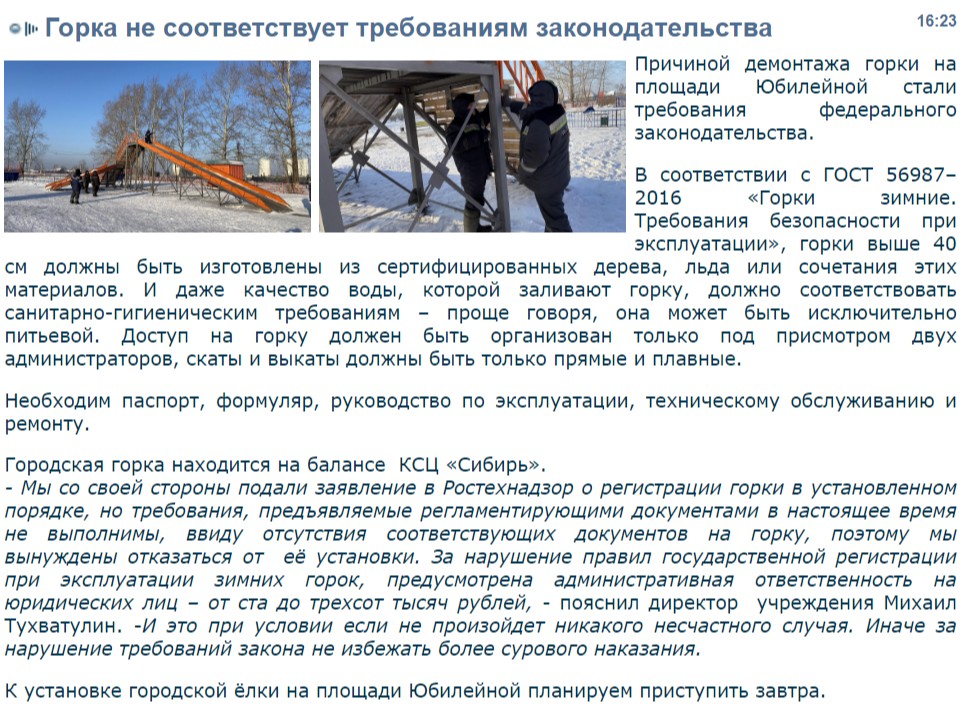 Чиновники объяснили это так: В соответствии с ГОСТ «Горки зимние. Требования безопасности при эксплуатации», горки выше 40 сантиметров должны быть изготовлены из сертифицированных дерева, льда или сочетания этих материалов. И даже качество воды, которой заливают горку, должно соответствовать санитарно-гигиеническим требованиям – проще говоря, она может быть исключительно питьевой. Доступ на горку должен быть организован только под присмотром двух администраторов, скаты и выкаты должны быть только прямые и плавные. Необходим паспорт, формуляр, руководство по эксплуатации, техническому обслуживанию и ремонту.